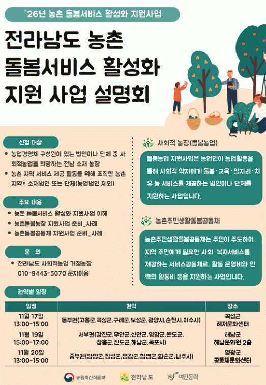 À̹ø ¼³¸íȸ´Â ³ó¾÷¡¤º¹Áö¡¤±³À°¡¤ÀÏÀÚ¸® ±â´ÉÀÌ À¶ÇÕµÈ ³óÃÌ µ¹º½¼ºñ½º(»çȸÀû³óÀ塤µ¹º½°øµ¿Ã¼)ÀÇ °¡Ä¡¸¦ ³Î¸® ¾Ë¸®°í, Àü³² ÁߺαÇ(¿µ±¤¡¤ÇÔÆò¡¤È¼ø¡¤´ã¾ç¡¤À强¡¤³ªÁÖ)¿¡¼ »ç¾÷¿¡ Âü¿©ÇÒ Áö¿ª Á¶Á÷À» ¹ß±¼Çϱâ À§ÇØ ¸¶·ÃµÆ´Ù.
