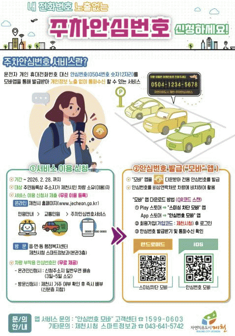 ¡®ÁÖÂ÷¾È½É¹øÈ£ ¼ºñ½º¡¯´Â Â÷·® ÁÖ¡¤Á¤Â÷ ½Ã ÈÞ´ëÀüȹøÈ£ ´ë½Å 0504 ¾È½É¹øÈ£¸¦ Á¦°øÇÔÀ¸·Î½á ½º¹Ì½Ì, º¸À̽ºÇǽÌ, ºÒ¹ý È«º¸ ¹®ÀÚ µî °¢Á¾ ÇÇÇØ¸¦ ¿¹¹æÇÒ ¼ö ÀÖ´Â ¼ºñ½º´Ù.