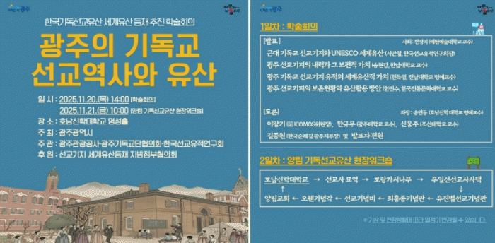 ±¤ÁÖ±¤¿ª½Ã´Â 20~21ÀÏ È£³²½ÅÇдëÇб³ ÀÏ¿ø¿¡¼ ¡®Çѱ¹±âµ¶¼±±³À¯»ê ¼¼°èÀ¯»ê µîÀç ÃßÁøÀ» À§ÇÑ ÇмúȸÀÇ¿Í ¿öÅ©¼ó¡¯À» ¿¾î Çѱ¹ ±Ù´ë ±âµ¶±³ ¼±±³ÀÇ ¿ª»çÀû °¡Ä¡¸¦ Á¶¸íÇÑ´Ù.