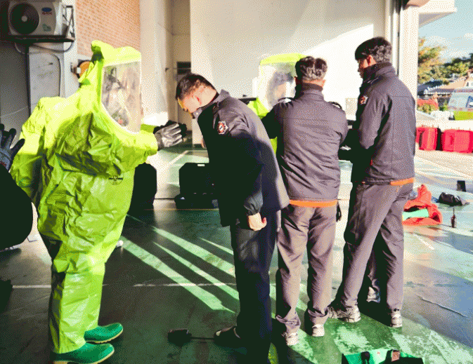 ÀÌ¾î¼ º¸°Ç¼Ò Ãʵ¿´ëÀÀ¿ä¿øÀ» ´ë»óÀ¸·Î °³ÀÎ º¸È£º¹(Level A)ÀÇ Âø¡¤Å»ÀÇ ¹æ¹ý°ú °ø±âÈ£Èí±â »ç¿ë¹ý µî ½Ç½À ±³À°À» ½Ç½ÃÇØ ÇöÀå´ëÀÀ´É·ÂÀ» °ÈÇß´Ù.