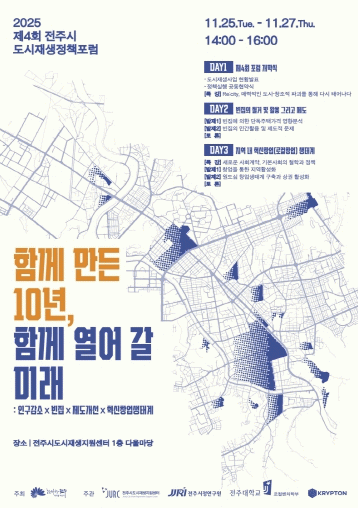 ÀüÁֽô ¿À´Â 25ÀϺÎÅÍ 27ÀϱîÁö 3Àϰ£ ÀüÁֽõµ½ÃÀç»ýÁö¿ø¼¾ÅÍ¿¡¼ µµ½ÃÀç»ý¿¡ °ü½ÉÀÌ Å« ½Ã¹Î°ú Àü¹®°¡, ½Ç¹«ÀÚ µîÀÌ ÇÔ²²ÇÏ´Â ¡®2025 Á¦4ȸ ÀüÁֽà µµ½ÃÀç»ýÁ¤Ã¥Æ÷·³¡¯À» °³ÃÖÇÑ´Ù°í 20ÀÏ ¹àÇû´Ù.