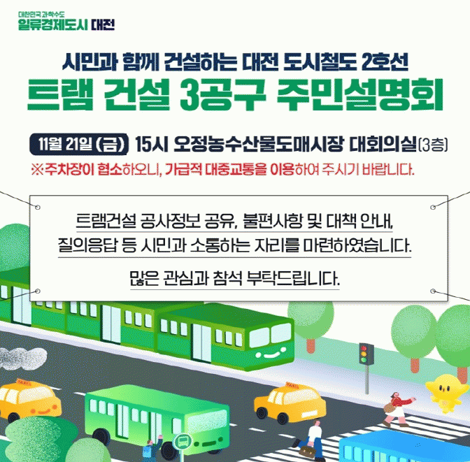3°ø±¸´Â ´ëÀü½Ã µ¿¼ÃàÀÇ ÁÖ¿ä µµ·ÎÀÎ Çѹç´ë·Î¸¦ Åë°úÇÏ´Â ³ë¼±À¸·Î Á߸®»ï°Å¸®¿¡¼ µÐ»êµ¿ ¼öÁ¤Å¸¿î(¾Æ)±îÁö À̾îÁö´Â ¾à 2.6km ±¸°£¿¡ Á¤°ÅÀå 3°³¼Ò(Á߸®, ¿ÀÁ¤, ¿ÀÁ¤³ó¼ö»ê¹°½ÃÀå) °Ç¼³ ¹× Çѹç´ë±³ ¹× Çϼö¹Ú½º ±¸Á¶¹° º¸° ¹× »ó¼öµµ µµ¼ö°ü·Î À̼³ °ø»ç µîÀÌ Æ÷ÇԵǾî ÀÖ´Ù.