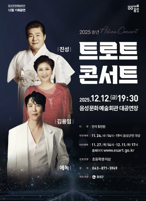 ¡®2025 ¼Û³â Æ®·ÎÆ® ÄܼƮ¡¯´Â ÃʵîÇлý ÀÌ»ó °ü¶÷ÀÌ °¡´ÉÇÏ´Ù. ƼÄÏÀº Àü¼® 5¸¸¿øÀ¸·Î 11¿ù 26ÀÏ 14½ÃºÎÅÍ À½¼º±º¹Î ´ë»óÀÇ ÇöÀå ¿¹¸Å ÈÄ 27ÀÏ 14½ÃºÎÅÍ À½¼º¹®È¿¹¼úȸ°ü ´©¸®Áý¿¡¼ 1ÀÎ 4¸Å±îÁö ¿¹¸Å °¡´ÉÇÏ´Ù.