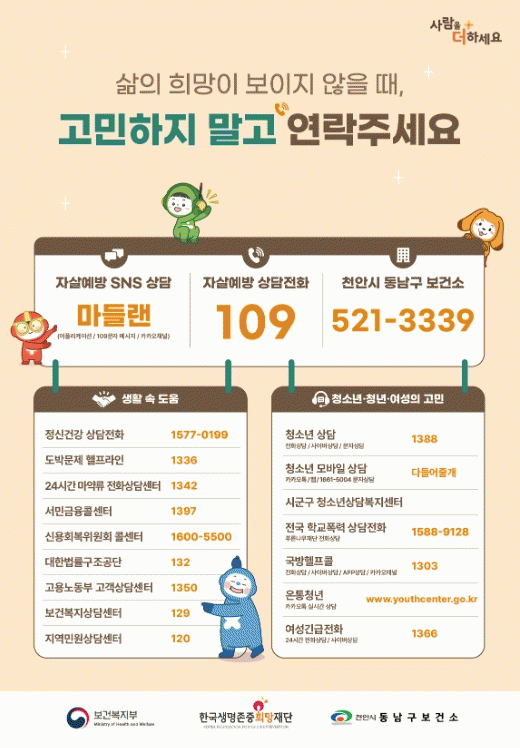 ÇÑÆí »î¿¡ Èñ¸ÁÀÌ º¸ÀÌÁö ¾ÊÀ» ¶§´Â °í¹ÎÇÏÁö ¸»°í 24½Ã Àڻ쿹¹æ »ó´ãÀüÈ(109), õ¾È½Ã µ¿³²±¸ Àڻ쿹¹æ¼¾ÅÍ, ¼ºÏ±¸ Àڻ쿹¹æ¼¾ÅÍ ¿¬¶ôÇϸé Àü¹®ÀûÀÎ »ó´ã°ú µµ¿òÀ» ¹ÞÀ» ¼ö ÀÖ´Ù.
