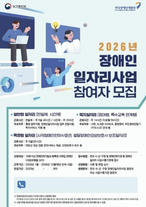»ç¾÷ ±â°£Àº 2026³â 1¿ùºÎÅÍ 12¿ù±îÁö 1³â°£À̸ç, À¾¸éµ¿ ÇàÁ¤º¹Áö¼¾Åͤý°ø°ø±â°ü¤ý»çȸº¹Áö½Ã¼³ µî¿¡¼ ÇàÁ¤ µµ¿ì¹Ì, »ç¹«º¸Á¶, ¹Î¿ø ¾È³», º¹Áö ¼ºñ½ºÁö¿ø ¿ä¿ø µîÀÇ ¾÷¹«¸¦ ¼öÇàÇÏ°Ô µÈ´Ù.