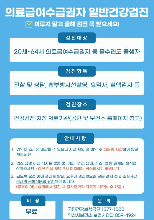 °Ç°°ËÁøÀº ±¹¹Î°Ç°º¸Çè°ø´Ü¿¡¼ ÁöÁ¤ÇÑ º´¡¤ÀÇ¿ø¿¡¼ ¹«·á·Î ¹ÞÀ» ¼ö ÀÖÀ¸¸ç, °ËÁø ±â°üÀº ±¹¹Î°Ç°º¸Çè°ø´Ü ´©¸®Áý ¶Ç´Â ÀÍ»ê½Ãº¸°Ç¼Ò ´©¸®Áý¿¡¼ È®ÀÎÇÒ ¼ö ÀÖ´Ù.