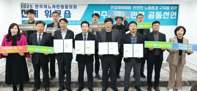 ¿öÅ©¼óÀÇ Ã¹ ¼ø¼´Â ¡®»ê¾÷ÀçÇØ ¾ø´Â ÀüÁÖ ½ÇÇö¡¯À» ¸ñÇ¥·Î ³»°Ç ³ë»ç¹ÎÁ¤ °øµ¿¼±¾ðÀ¸·Î Âü¼®ÀÚµéÀº ¡â¾ÈÀüº¸°Ç ±³À° Âü¿© ¡â¹ý·É Áؼö ¡âÁö¿ª»çȸ Âü¿© È®´ë ¡âÁ¤Ã¥ Áö¿ø °È µî °¢ ÁÖüÀÇ Ã¥¹«¸¦ ÇÔ²² ¼±¾ðÇϸç, »ê¾÷ÀçÇØ ¿¹¹æÀ» ÀüÁÖ½ÃÀÇ ÇÙ½É °¡Ä¡·Î »ï¾Æ 2026³â ¾ÈÀüÇÑ ³ëµ¿È¯°æ Á¶¼ºÀ» ¹Ýµå½Ã ´Þ¼ºÇϰڴٴ °øµ¿ ÀÇÁö¸¦ ¹àÇû´Ù.