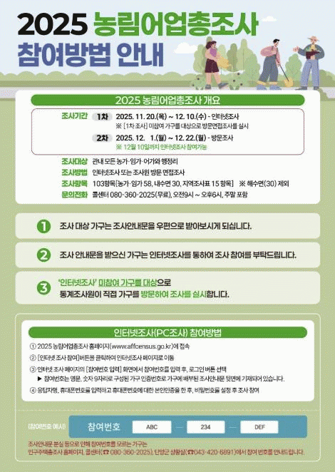 ÀÎÅͳÝÁ¶»ç´Â ³ó¸²¾î¾÷ÃÑÁ¶»ç ´©¸®ÁýÀ» ÅëÇØ 11¿ù 20ÀϺÎÅÍ 12¿ù 10ÀϱîÁö Âü¿©ÇÒ ¼ö ÀÖ´Ù. ÀÎÅͳÝÁ¶»ç¿¡ Âü¿©ÇÏÁö ¾ÊÀº °¡±¸´Â 12¿ù 1ÀϺÎÅÍ 22ÀϱîÁö Á¶»ç¿øÀÌ Á÷Á¢ ¹æ¹®ÇØ ¸éÁ¢Á¶»ç¸¦ ÁøÇàÇÒ ¿¹Á¤ÀÌ´Ù.