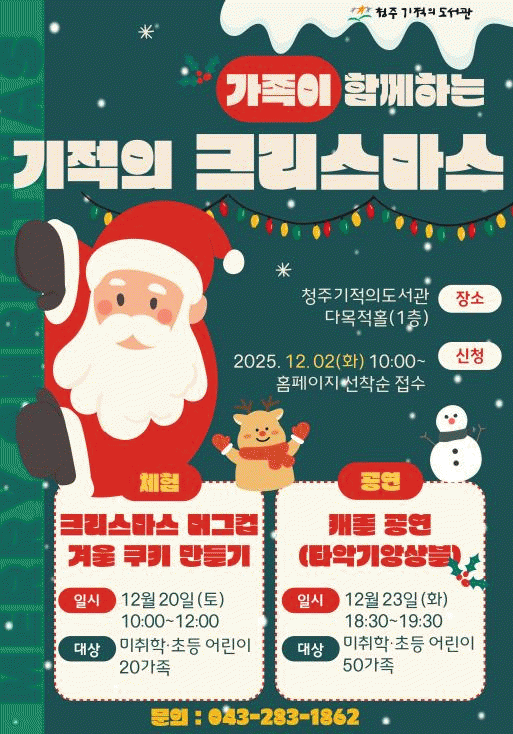 ¿ÃÇØ Çà»ç´Â Å©¸®½º¸¶½º ½ÃÁðÀ» ¸ÂÀÌÇØ °¡Á·ÀÌ ÇÔ²² Áñ±æ ¼ö ÀÖ´Â ¸¸µé±â üÇè°ú À½¾Ç°ø¿¬À¸·Î ±¸¼ºµÈ´Ù.