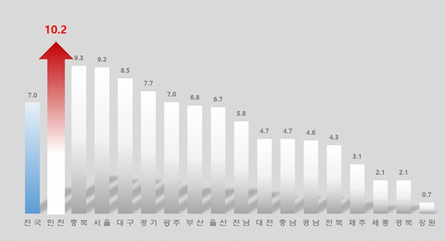 Åë°èûÀÌ ¹ßÇ¥ÇÑ ¡®2025³â 9¿ù Àα¸µ¿Ç⡯¿¡ µû¸£¸é, ÀÎõ½Ã´Â ¿ÃÇØ 1¿ùºÎÅÍ 9¿ù±îÁö Ãâ»ý¾Æ ¼ö°¡ Àü³â °°Àº ±â°£º¸´Ù 10.2% ´Ã¾î³ª Àü±¹ 17°³ ½Ã¡¤µµ °¡¿îµ¥ °¡Àå ³ôÀº Áõ°¡À²À» º¸¿´´Ù. ¹Ý¸é, ÃæºÏ(9.3%)°ú ¼¿ï(9.2%)ÀÌ ±× µÚ¸¦ À̾úÀ¸¸ç Àü±¹ Æò±Õ Áõ°¡À²Àº 7.0%¿¡ ±×ÃÆ´Ù.
