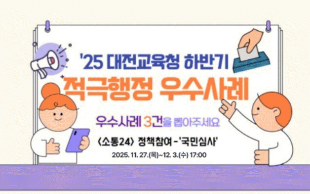 ´ëÀü½Ã±³À°Ã» ÀÌÂ÷¿ø °¨»ç°üÀº ¡°¿Â¶óÀÎ ±¹¹Î½É»ç¿¡ ¸¹Àº °ü½É°ú Âü¿©¸¦ ºÎŹ µå¸°´Ù¡±¸ç ¡°±¹¹Î ÇÑ ºÐ ÇÑ ºÐÀÇ Âü¿©°¡ ´õ ³ªÀº ÇàÁ¤À» ¸¸µå´Â ¹Ø°Å¸§ÀÌ µÇ´Ï, Àû±ØÀûÀ¸·Î ¾÷¹«¸¦ ÃßÁøÇÑ °ø¹«¿øµéÀÇ »ç·Ê¸¦ È®ÀÎÇÏ½Ã°í ¼ÒÁßÇÑ ÀǰßÀ» º¸ÅÂÁֽñ⠹ٶõ´Ù¡±¶ó°í ¹àÇû´Ù.