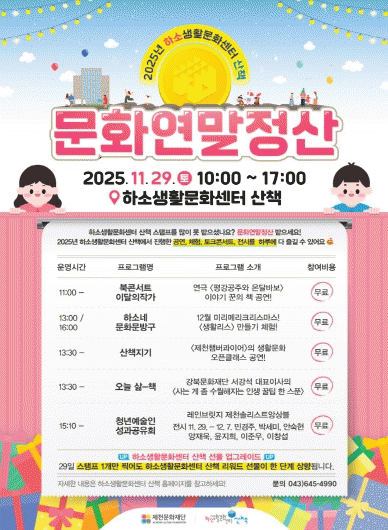 ¿ÀÈÄ, Àι®ÇС¤»ýȰ¹®È¡¤Ã»³â¿¹¼úÀÌ À̾îÁö´Â ¡®Ç®ÄÚ½º »êÃ¥¡¯ - »êÃ¥Áö±â ¿ÀÇÂŬ·¡½º 3ȸÂ÷´Â ´çÀÏ 1½Ã 30ºÐºÎÅÍ 2½Ã±îÁö, ÇϼһýȰ¹®È¼¾ÅÍ »êÃ¥ 3Ãþ »êåȦ¿¡¼ ÁøÇàµÈ´Ù. »ýȰ¹®Èµ¿È£È¸¿¡¼ À°¼ºÁö¿ø»ç¾÷´Üü·Î ¼ºÀåÇÑ Á¦Ãµ ¿¹¼ú´Üü ¡®Á¦ÃµÃ¨¹öÄâÀ̾î(ÇÕâ´Ü)¡¯°¡ ¹«´ë¿¡ ¿Ã¶ó, ½Ã¹ÎÀÌ Á÷Á¢ ÁÖü°¡ µÇ´Â »ýȰ¹®È °ø¿¬À¸·Î ¿¬¸»ÀÇ µû¶æÇÑ ºÐÀ§±â¸¦ ´õÇÒ ¿¹Á¤ÀÌ´Ù.