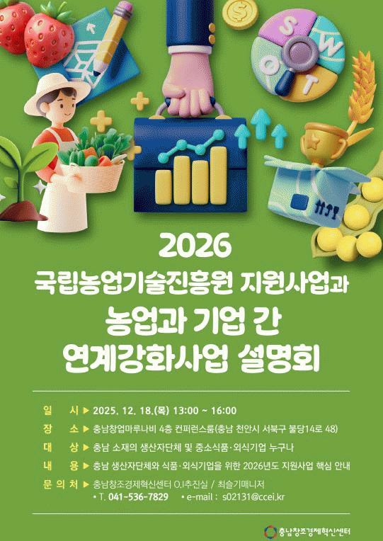 ¼³¸íȸ¿¡¼´Â ¸ÕÀú ¡®2026 ³ó¾÷°ú ±â¾÷ °£ ¿¬°è°È»ç¾÷¡¯ ¾È³»¸¦ ÅëÇØ »ç¾÷ÀÇ ¸ñÀû, Áö¿ø´ë»ó, Áö¿ø³»¿ë, ½Åû ¹æ¹ý ¹× ¸ðÁýÀÏÁ¤ µîÀ» ¼Ò°³Çϰí, ÀÌ¾î¼ ¡°2026 ±¹¸³³ó¾÷±â¼úÁøÈï¿ø ³ó¾÷Á¤Ã¥ Áö¿ø»ç¾÷¡±ÀÌ ¾È³»µÉ ¿¹Á¤ÀÌ´Ù.