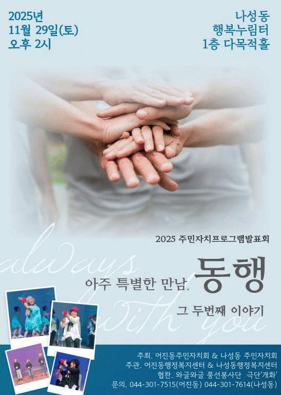 Á¤¼ºÇå ¾îÁøµ¿ ÁÖ¹ÎÀÚġȸÀåÀº ¡°µÎ ¸¶À»ÀÌ ÇÔ²² ºú¾î³½ À̹ø Çà»ç¸¦ ÅëÇØ »ç¶÷ÀÇ °¡Ä¡, ¿¬´ëÀÇ ¾Æ¸§´Ù¿òÀÌ ¼¼Á¾½Ã Àü¿ªÀ¸·Î ÆÛÁ®°¡°Ô µÇ±â¸¦ ±â´ëÇÑ´Ù¡±¸ç ¡°¾îÁøµ¿°ú ³ª¼ºµ¿ÀÌ ´õ¿í ±× »ó¡À¸·Î¼ ÀÚ¸®Àâ¾Æ°¡±â¸¦ ¹Ù¶õ´Ù¡±°í ÀüÇß´Ù.