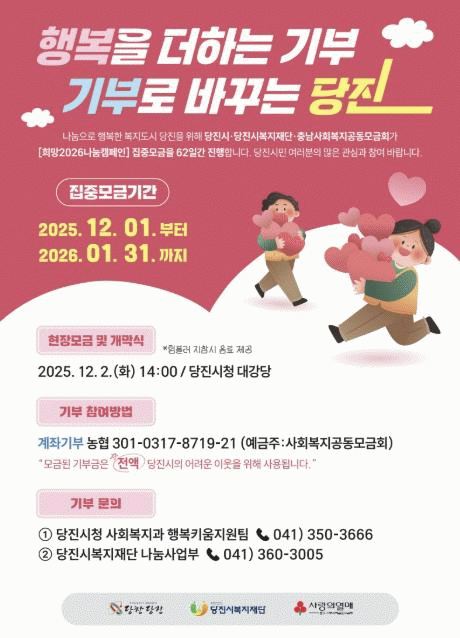 ½Ã´Â ¿À´Â 12¿ù 2ÀÏ ¿ÀÈÄ 2½Ã ´çÁøÃ» ´ë°´ç¿¡¼ ¡®Èñ¸Á 2026 ³ª´® Ä·ÆäÀÎ ÀÌ¿ôµ½±â ¼º±Ý¸ð±Ý °³¸·½Ä¡¯À» °³ÃÖÇϰí ÇöÀå ¸ð±Ý Çà»ç¸¦ ÁøÇàÇÒ ¿¹Á¤ÀÌ´Ù.
