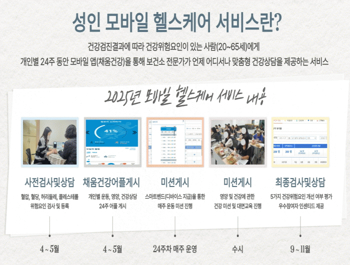 ¸ð¹ÙÀÏ ÇコÄɾî´Â °£È£»ç¡¤¿µ¾ç»ç¡¤¿îµ¿Àü¹®°¡ µî º¸°Ç¼Ò Àü¹® ÀηÂÀÌ Âü¿©ÀÚÀÇ »ýȰ ½À°üÀ» 6°³¿ù°£ ºÐ¼®ÇØ 1:1 »ó´ã°ú °³¼± Àü·«À» Á¦°øÇÏ´Â ¹æ½ÄÀ¸·Î ¿î¿µµÆ´Ù. Âü¿©ÀÚ¿¡°Ô´Â ½º¸¶Æ®¿öÄ¡°¡ Áö¿øµÇ°Å³ª, »ï¼ºÇコ¡¤°Ç°Çコ ¾Û°ú ÀÚµ¿ ¿¬µ¿µÇ´Â Ȱµ¿°è¸¦ Ȱ¿ëÇØ Ȱµ¿·®, Ç÷¾Ð, Ç÷´ç, ½Ä´Ü µî »ýȰ µ¥ÀÌÅ͸¦ ÀÚµ¿ ±â·Ï¡¤°ü¸®Çϵµ·Ï ÇÏ¿© ´õ Á¤¹ÐÇÑ °³ÀÎ ¸ÂÃãÇü »ó´ãÀÌ °¡´ÉÇß´Ù.
