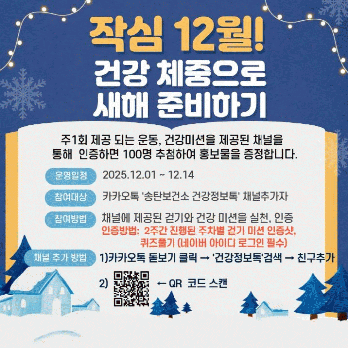 À̹ø 縰Áö´Â īī¿ÀÅå ä³Î ¡®¼Ûźº¸°Ç¼Ò °Ç°Á¤º¸Å塯À» Ãß°¡ÇÑ ½Ã¹ÎÀ̶ó¸é º°µµÀÇ ½Åû ¾øÀÌ ÀÚÀ¯·Ó°Ô Âü¿© °¡´ÉÇϸç, 2ÁÖ µ¿¾È ÁÖ 1ȸ¾¿ ¾È³»µÇ´Â °È±â¹Ì¼Ç°ú °Ç°¹Ì¼Ç µî ÃÑ 4°¡Áö ¹Ì¼ÇÀ» ¸ðµÎ ¼öÇàÇÑ ÈÄ, īī¿ÀÅå ä³Î ³» ÄûÁî ¶Ç´Â »çÁø ÀÎÁõ ¹öưÀ» ÅëÇØ ÀÎÁõÀ» ¿Ï·áÇÏ¸é µÈ´Ù.