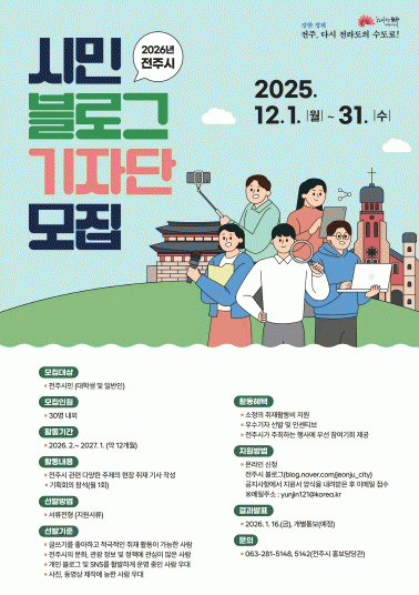 2026³â ½Ã¹Î ºí·Î±× ±âÀÚ´ÜÀº ÃÑ 30¸í ³»¿Ü·Î ¼±¹ßµÉ ¿¹Á¤À¸·Î, ÀüÁֽÿ¡ °ÅÁÖÇÏ´Â ½Ã¹ÎÀÌ¸é ´©±¸³ª Áö¿øÇÒ ¼ö ÀÖ´Ù. ÇÕ°ÝÀÚ´Â ³»³â 1¿ù 16ÀÏ ¹ßÇ¥µÉ ¿¹Á¤ÀÌ´Ù.