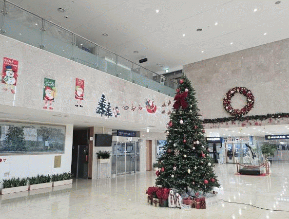 ±ºÃ»»ç Á¤¹® ÃâÀÔ±¸ ij³ëÇÇ À§ Á¶¸í Æ®¸®¿Í û»ç ³»ºÎ 5m ³ôÀÌÀÇ ´ëÇü Å©¸®½º¸¶½º Æ®¸®´Â ¹à°í È»çÇÑ ºÐÀ§±â¸¦ ¿¬ÃâÇØ ¹æ¹®°´¿¡°Ô Áñ°Å¿î ¿¬¸» °¨¼ºÀ» ¼±»çÇϰí ÀÖ´Ù.