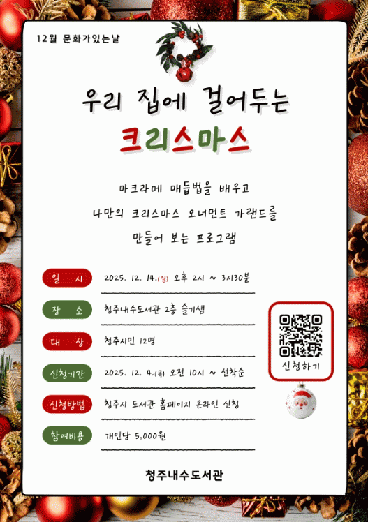 ¡®¿ì¸® Áý¿¡ °É¾îµÎ´Â Å©¸®½º¸¶½º¡¯¶ó´Â Á¦¸ñÀ¸·Î ÁøÇàµÇ´Â À̹ø ÇÁ·Î±×·¥Àº ¿À´Â 14ÀÏ ¿ÀÈÄ 2½ÃºÎÅÍ 3½Ã 30ºÐ±îÁö 2Ãþ ½½±â»ù¿¡¼ ¿¸°´Ù.