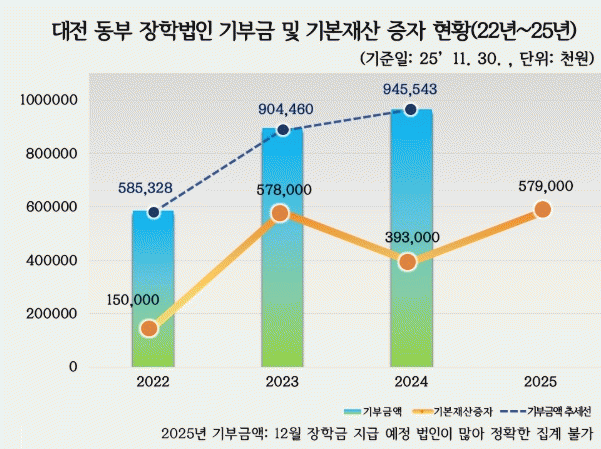 ÀåÇÐÀç´Ü ¹ýÀÎÀº ±âº»Àç»ê¿¡¼ ¹ß»ýÇÏ´Â ¿¹±ÝÀÌÀÚ¿Í ±âºÎ±ÝÀ¸·Î ¿î¿µµÇ°í ÀÖÀ¸³ª Àú±Ý¸® ±âÁ¶¿Í °æ±âħü·Î ÀÎÇÑ Á¤±â ±âŹÀÚ°¡ °¨¼ÒÇÏ¸é¼ ÀåÇÐ±Ý Áö±Þ¿¡ ¾î·Á¿òÀ» °Þ°í ÀÖ´Â »óȲÀÌ´Ù. ±×·³¿¡µµ ºÒ±¸ÇÏ°í ¿¹±ÝÀÌÀÚ ¼öÀÍÀ» ³ôÀ̱â À§ÇÑ ±âº»Àç»ê ÁõÀÚ ¶ÇÇÑ 2022³â ´ëºñ(150,000õ¿ø) 2025³â(11¿ù 30ÀÏ ±âÁØ 579,000õ¿ø) 286% Áõ°¡Çß´Ù.