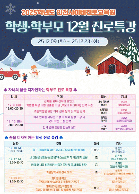 Ư°Àº ÀÎõ °ü³» ÃÊ¡¤Áß¡¤°í Çлý°ú Çкθ𠴩±¸³ª 12¿ù 3ÀϺÎÅÍ ÀÎõ»çÀ̹öÁø·Î±³À°¿ø ´©¸®Áý¿¡¼ ½ÅûÇÒ ¼ö ÀÖÀ¸¸ç, ¸ðµç °ÀÇ´Â ½Ç½Ã°£ ¿Â¶óÀÎ ¹æ½ÄÀ¸·Î ÁøÇàµÈ´Ù.