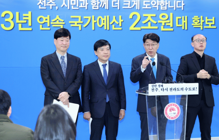 ¿ì¹ü±â ÀüÁÖ½ÃÀå°ú À̼ºÀ± ±¹È¸ÀÇ¿ø(´õºÒ¾î¹ÎÁÖ´ç, ÀüÁÖ½ÃÀ»)Àº 4ÀÏ ½Ãû 4Ãþ ´ëȸÀǽǿ¡¼ 2026³â ±¹°¡¿¹»ê È®º¸ °ü·Ã ºê¸®ÇÎÀ» ¿°í, ³»³âµµ ±¹°¡ ¿¹»êÀ¸·Î ¿ÃÇØ ´çÃÊ ¿¹»ê(2Á¶ 1595¾ï ¿ø)º¸´Ù 1340¾ï ¿ø(6.2%) ´Ã¾î³ 2Á¶ 2925¾ï ¿øÀ» È®º¸Çß´Ù°í 4ÀÏ ¹àÇû´Ù.