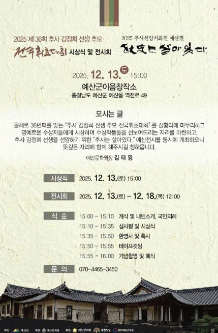 ¹®È¿ø °ü°èÀÚ´Â ¡°Ãß»ç ±èÁ¤Èñ ¼±»ýÀÇ ¿¹¼ú Á¤½ÅÀ» ±â¸®´Â Àü±¹ ±Ô¸ðÀÇ ´ëȸ¸¦ ÅëÇØ ¼¿¹¹®È È®»ê¿¡ ±â¿©Çϰí ÀÖ´Ù¡±¸ç ¡°¸¹Àº ºÐµéÀÌ Àü½Ã¸¦ ÅëÇØ ¼¿¹ÀÇ ±íÀÌ¿Í °¡Ä¡¸¦ ´À³¢±æ ¹Ù¶õ´Ù¡±°í ¸»Çß´Ù.