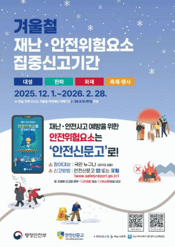 ÁýÁß½Å°í ´ë»óÀº ¡â´ë¼³·Î ÀÎÇÑ µµ·Î °áºù ¹× ÅëÇà ºÒÆí ¡âºñ´ÒÇϿ콺, ¿Ëº® µîÀÇ ºØ±« À§Çè ¡âÇÑÆÄ·Î ÀÎÇÑ ¼öµµ°ü¡¤½Ã¼³¹° µ¿ÆÄ, Ãë¾à°èÃþ ÇÇÇØ ¡â³¹æ±â±â¡¤Àü±â¡¤°¡½º µî ÈÀç À§Çè¿ä¼Ò ¡âÀÎȹ°Áú ¹æÄ¡, ºÒ¹ý ¼Ò°¢ µî ¾ÈÀü¼öÄ¢ ¹ÌÁؼö ¡â¿¬¸»¿¬½Ã ¹× °Ü¿ïö Çà»ç¡¤ÃàÁ¦Àå¿¡¼ÀÇ ÀÎÆÄ ¹ÐÁý ¡âÀü±â¡¤°¡½º ¾ÈÀü»ç°í µî °Ü¿ïö¿¡ ƯÈ÷ Ãë¾àÇÑ °¢Á¾ Àç³À§Çè ¿ä¼Ò°¡ Æ÷ÇԵȴÙ.