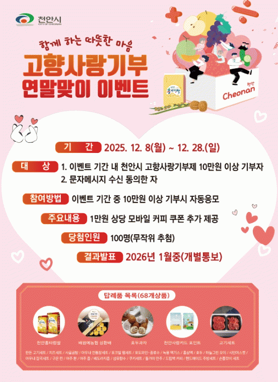 À̺¥Æ® ±â°£µ¿¾È °íÇâ»ç¶ûeÀ½ ´©¸®ÁýÀ» ÅëÇØ õ¾È½Ã¿¡ 10¸¸ ¿ø ÀÌ»ó ±âºÎÇϰí, ¹®ÀÚ¸Þ½ÃÁö ¼ö½Å¿¡ µ¿ÀÇÇϸé ÀÚµ¿ ÀÀ¸ðµÈ´Ù.