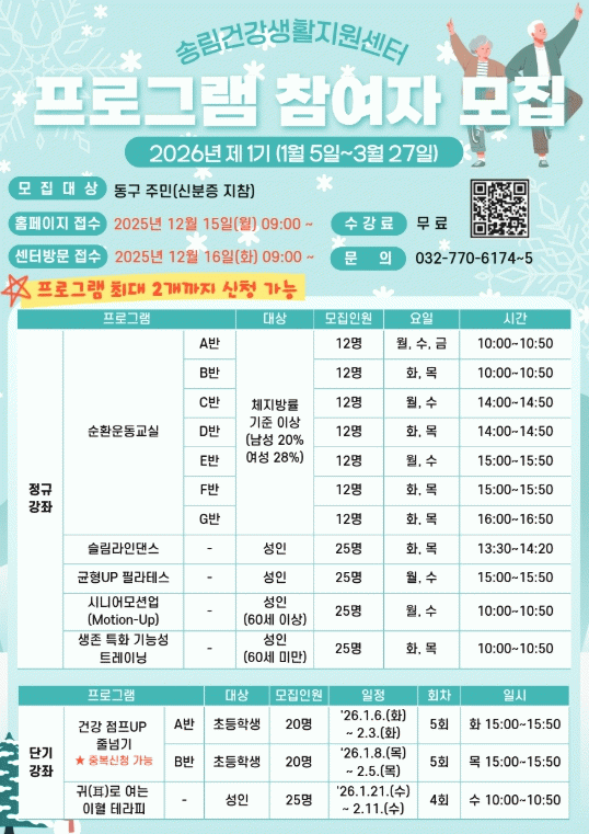 ¸ðÁý ±â°£Àº ¿À´Â 15ÀϺÎÅÍÀÌ¸ç ¿î¿µ ±â°£Àº 2026³â 1¿ù5ÀÏ~3¿ù27ÀϱîÁö´Ù. Âü¿©ÀÚµéÀº °Ç° ÁõÁøÀ» À§ÇÑ ´Ù¾çÇÑ ¿îµ¿ ¹× ±³À° ÇÁ·Î±×·¥À» ±³À° ¹Þ°Ô µÈ´Ù.