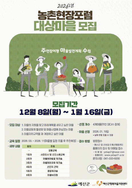 ±ºÀº 2026³â ÃÑ 4°³ ¸¶À»À» ¼±Á¤ÇØ °èȹ ¼ö¸³ Àü °úÁ¤À» Áö¿øÇÒ ¿¹Á¤À̸ç, ½Å±Ô ÃßÁø ¸¶À»»Ó ¾Æ´Ï¶ó ±âÁ¸ ³óÃÌÁö¿ª°³¹ß»ç¾÷ ÃßÁø °æÇèÀÌ ÀÖÀ¸³ª Çö¾È ÇØ°áÀ̳ª Ȱ·Â ȸº¹ÀÌ ÇÊ¿äÇÑ ¸¶À»µµ ½ÅûÇÒ ¼ö ÀÖ´Ù.