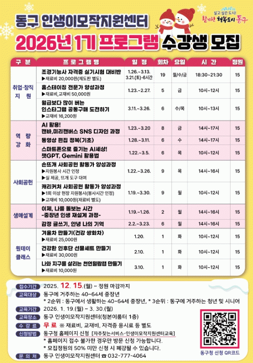 Âü¿© ´ë»óÀº µ¿±¸¿¡ °ÅÁÖÇÏ´Â 40~64¼¼ ÁßÀå³âÀ̸ç, ½ÅûÀº µ¿±¸Ã» ȨÆäÀÌÁö(ÀλýÀ̸ðÀÛÁö¿ø¼¾ÅÍ ±³À° ºÐ¾ß)¸¦ ÅëÇØ °¡´ÉÇÏ´Ù.