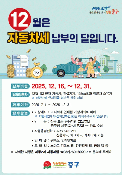 À̹ø 12¿ù Á¤±âºÐ ÀÚµ¿Â÷¼¼´Â ¿ÃÇØ 7¿ù 1ÀϺÎÅÍ 12¿ù 31ÀϱîÁö 6°³¿ù°£ ÀÚµ¿Â÷ ¼ÒÀ¯ ±â°£¿¡ ´ëÇÑ ¼¼±ÝÀ¸·Î, ºÎ°ú ´ë»óÀº 12¿ù 1ÀÏ ÇöÀç ÀÚµ¿Â÷µî·Ï¿øºÎ»óÀÇ ¼ÒÀ¯ÀÚ´Ù.