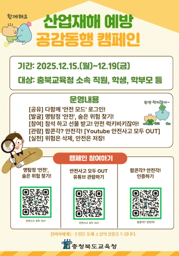 Ä·ÆäÀÎ '(°øÀ¯) ´ÙÇÔ²² ¾ÈÀü ¸ðµå ·Î±×ÀÎ' Ȱµ¿À¸·Î ÃæºÏ µµ³» Àü ±â°ü°ú Çб³°¡ ´©¸®Áý, ¼ÒÅë¸Þ½ÅÀú, »ê¾÷¾ÈÀüº¸°Ç °Ô½ÃÆÇ µî¿¡ Ä·ÆäÀÎ Æ÷½ºÅ͸¦ °Ô½ÃÇØ, ¸ðµç ±³À°°¡Á·ÀÌ »ê¾÷ÀçÇØ ¿¹¹æ ÁÖ°£ÀÓÀ» ÀνÄÇϰí ÀÚ¿¬½º·´°Ô µ¿ÂüÇÒ ¼ö ÀÖ´Â ºÐÀ§±â¸¦ Á¶¼ºÇÑ´Ù.