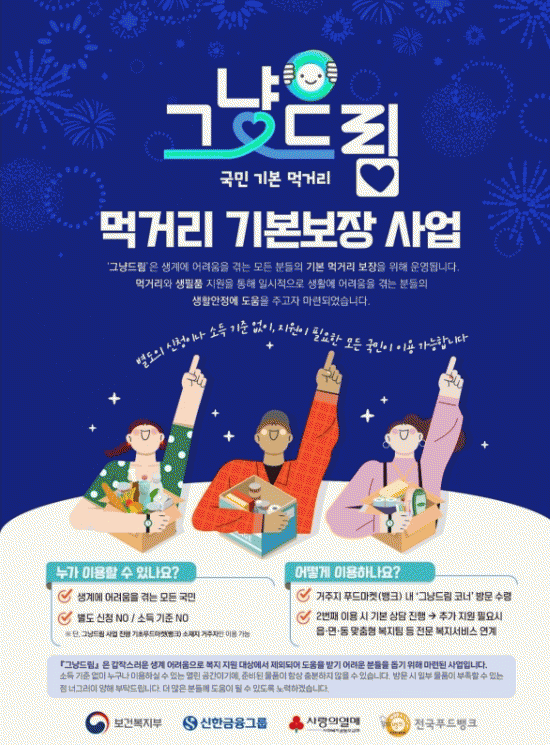 15ÀÏ ÀÍ»ê½Ã¿¡ µû¸£¸é Á¤ºÎ°¡ »õ·Î µµÀÔÇÏ´Â '±×³Éµå¸²' »ç¾÷Àº °©ÀÛ½º·¯¿î »ý°è À§±â³ª Áúº´, ½ÇÁ÷ µîÀ¸·Î ½Ä·áǰ Áö¿øÀÌ ÇÊ¿äÇÑ ½Ã¹Î¿¡°Ô Áï½Ã ½Ä·áǰÀ» Á¦°øÇÏ´Â ±¹°¡ Â÷¿øÀÇ º¹Áö º¸Àå Á¤Ã¥ÀÌ´Ù. Áö¿ø ÀýÂ÷¸¦ °£¼ÒÈÇØ Á¢±Ù¼ºÀ» ³ôÀÎ °ÍÀÌ Æ¯Â¡ÀÌ´Ù.