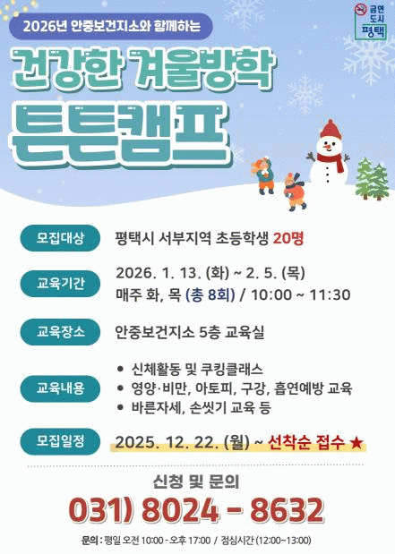 À̹ø ÇÁ·Î±×·¥Àº 2026³â 1¿ù 13ÀϺÎÅÍ 2¿ù 5ÀϱîÁö ¸ÅÁÖ È¡¤¸ñ¿äÀÏ, ÁÖ 2ȸ¾¿ ÃÑ 8ȸ¿¡ °ÉÃÄ ÁøÇàµÇ¸ç, ¼ºÀå±â ¾Æµ¿µéÀÌ Áñ°Ì°Ô Âü¿©ÇÏ¸é¼ ¿Ã¹Ù¸¥ °Ç°»ýȰ ½À°üÀ» Çü¼ºÇÒ ¼ö ÀÖµµ·Ï ´Ù¾çÇÑ ³»¿ëÀ¸·Î ±¸¼ºµÆ´Ù.