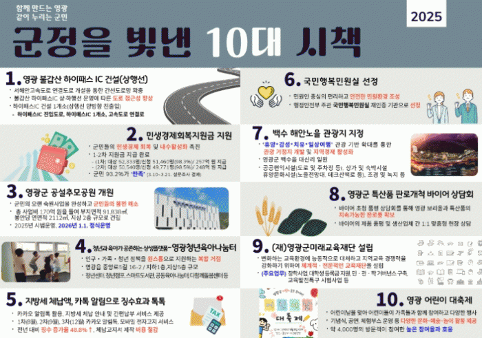 ÀÌ¾î ¿ì¼ö½ÃÃ¥¿¡´Â ¡ã¹Î»ý°æÁ¦È¸º¹Áö¿ø±Ý Áö¿ø ¡ã¿µ±¤±º °ø¼³Ãß¸ð°ø¿ø °³¿øÀÌ Æ÷ÇÔµÆÀ¸¸ç, Àå·Á½ÃÃ¥À¸·Î´Â ¡ãû³â°ú À°¾Æ°¡ °øÁ¸ÇÏ´Â »ó»ý Ç÷§Æû-¿µ±¤Ã»³âÀ°¾Æ³ª´®ÅÍ ¡ãÁö¹æ¼¼ ü³³¾× Ä«Åå ¾Ë¸² ¡¼öÈ¿°ú°¡ À̸§À» ¿Ã·È´Ù.