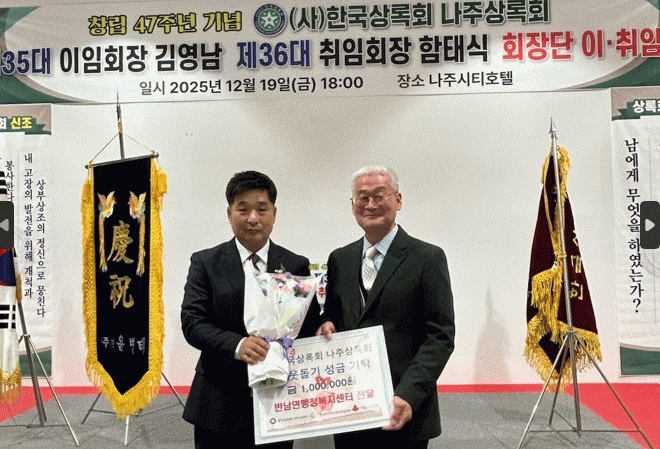 (»ç)Çѱ¹»ó·Ïȸ ³ªÁÖ»ó·Ïȸ ÀÌ¡¤ÃëÀÓ È¸Àå´Ü(Á¦35´ë ±è¿µ³², Á¦36´ë ÇÔŽÄ)Àº ¡°Ã¢¸³ 47ÁÖ³âÀ» ¸Â¾Æ Áö¿ª»çȸ¿¡ µû¶æÇÑ ¸¶À½À» ÀüÇÒ ¼ö ÀÖ¾î ¶æ±í´Ù¡±¸ç ¡°¾ÕÀ¸·Îµµ Áö¿ª°ú ÇÔ²² È£ÈíÇϸç Áö¼ÓÀûÀÎ ³ª´®°ú ºÀ»ç¸¦ ½ÇÃµÇØ ³ª°¡°Ú´Ù¡±°í ¹àÇû´Ù.