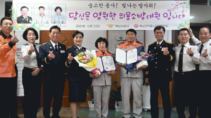À̳¯ ÅðÀÓ½ÄÀº ¿À·£ ±â°£ Áö¿ª»çȸ ¾ÈÀüÀ» À§ÇØ Çå½ÅÇØ¿Â ÇØ³²ÀÇ¿ë¼Ò¹æ´ë ÀÌ¿µ¼± ¤ý±è´ö¸¸¤ý±èÁö¿ø ´ë¿øÀÇ ³ë°í¿¡ °¨»ç¸¦ ÀüÇϰí, ¸í¿¹·Î¿î ÅðÀÓÀ» ÃàÇÏÇϱâ À§ÇØ ¸¶·ÃµÆ´Ù.