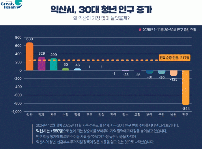 ÀÍ»ê½Ã´Â ÀüºÏ 14°³ ½Ã±º °¡¿îµ¥ ¿ÃÇØ °¡Àå ¸¹Àº 30´ë û³â Àα¸ À¯ÀÔÀ» ±â·ÏÇϸç, 'Ȱ·Â µµ½Ã'·ÎÀÇ Àüȯ È帧À» ½ÇÁúÀûÀÎ ¼öÄ¡·Î ÀÔÁõÇß´Ù°í 24ÀÏ ¹àÇû´Ù.