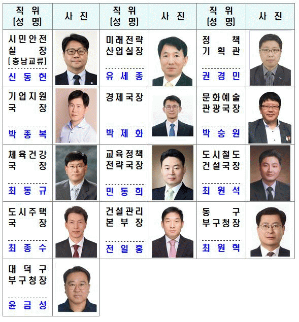 ¸ÕÀú, ½ÇÀå±Þ 3ÀÚ¸® ¸ðµÎ Àü¸éÀûÀÎ ±³Ã¼°¡ ÀÌ·ç¾îÁø °¡¿îµ¥ ´ëÀü-Ãæ³² ÇàÁ¤ ÅëÇÕÀÇ ±âƲÀ» ¸¶·ÃÇϱâ À§ÇØ 2±Þ °íÀ§°ü¸®ÀÚ ±³·ù°¡ ´ÜÇàµÇ¸é¼ ½ÇÀå±Þ 1¸í¾¿ »óÈ£ ±³·ù¸¦ ÇÏ°Ô µÈ´Ù.