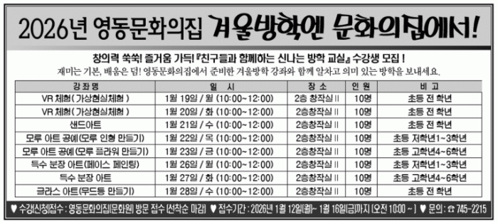 À̹ø °Ü¿ï¹æÇРƯ°Àº VR üÇè(°¡»óÇö½ÇüÇè)À» ºñ·ÔÇØ »÷µå¾ÆÆ®, ¸ð·ç ¾ÆÆ® °ø¿¹(ÀÎÇü¡¤Çöó¿ö ¸¸µé±â), Ư¼ö ºÐÀå ¾ÆÆ®(ÆäÀ̽º ÆäÀÎÆÃ), ±Û¶ó½º ¾ÆÆ®(¹«µåµî ¸¸µé±â) µî ´Ù¾çÇÑ Ã¼ÇèÇü °Á·Π±¸¼ºµÆ´Ù.