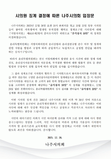 ±× °á°ú À±¸®Æ¯º°À§¿øÈ¸´Â ¡°è¿ä±¸µÈ ½ÃÀÇ¿øÀÇ ÇàÀ§°¡ ¨ç½ÃÀÇ¿øÀ¸·Î¼ ǰÀÇÀ¯ÁöÀǹ«¸¦ À§¹ÝÇÑ Á¡, ¨è¿ÜºÎ Àü¹®°¡·Î ±¸¼ºµÈ À±¸®½É»çÀÚ¹®À§¿ø¿¡¼ ¡°è´ë»óÀ¸·Î ÆÇ´ÜÇÑ Á¡, ¨éÀÌ »ç°ÇÀÌ ³ªÁÖ½ÃÀÇ¿øÀ» ´ë»óÀ¸·Î ÇÑ °íÀ§Á÷ 4´ë Æø·Â ÅëÇÕ±³À°ÀÌ ÁøÇàµÇ´ø ½Ã°£¿¡ ÀÏ¾î³ Á¡ µîÀ» °í·ÁÇÏ¿© Áß¡°è¿¡ ÇØ´çÇÏ´Â ¡®Ãâ¼®Á¤Áö 10ÀÏ¡¯ÀÇ Â¡°è¸¦ ÀǰáÇßÀ¸¸ç, 12¿ù 26ÀÏ ¿¸° º»È¸ÀÇ¿¡¼µµ À±¸®Æ¯º°À§¿øÈ¸ÀÇ ½É»ç °á°ú¸¦ ¹Þ¾Æµé¿© ¡®Ãâ¼®Á¤Áö 10ÀÏ¡¯ÀÇ Â¡°è¸¦ È®Á¤Çß´Ù°í ¹àÇû´Ù.