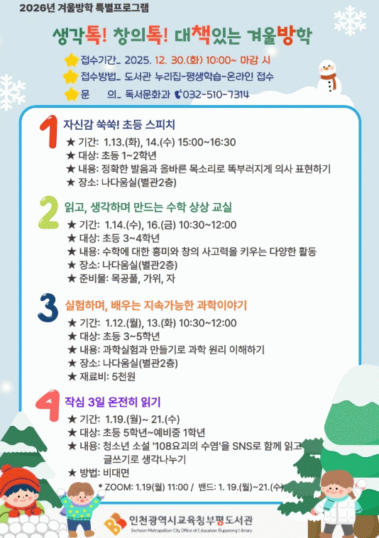 ¶ÇÇÑ ¡ãÃʵî 5ÇгâºÎÅÍ ¿¹ºñ Áß1ÇгâÀ» ´ë»óÀ¸·Î û¼Ò³â ¼Ò¼³¡º108¿ä±«ÀÇ ¼ö¿°¡»À» SNS·Î ÇÔ²² ÀÐ°í ±Û¾²±â·Î »ý°¢À» ³ª´©´Â ¡®ÀÛ½É3ÀÏ ¿ÂÀüÈ÷ Àб⡯¸¦ ¿î¿µÇÑ´Ù.