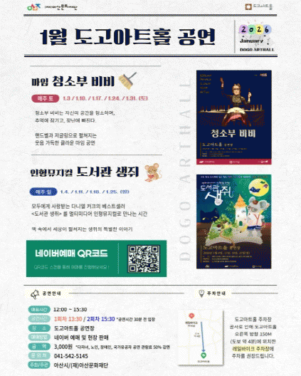 2026³â 1¿ù °ø¿¬Àº Å䡤ÀÏ ÁÖ¸» »ó½Ã °ø¿¬À¸·Î ¿î¿µµÇ¸ç, ¸ðµç °ø¿¬Àº 1ÀÏ 2ȸÂ÷(13:30, 15:30)·Î ÁøÇàµÈ´Ù. 1¿ù ÁÖ¿ä °ø¿¬ ÇÁ·Î±×·¥Àº ¡ãÅä¿äÀÏ(1~5ÁÖ) ¸¶ÀÓ ¡´Ã»¼ÒºÎ ºñºñ¡µ ¡ãÀÏ¿äÀÏ(1~4ÁÖ) ÀÎÇü ¹ÂÁöÄà ¡´µµ¼°ü »ýÁ㡵·Î ±¸¼ºµÈ´Ù.