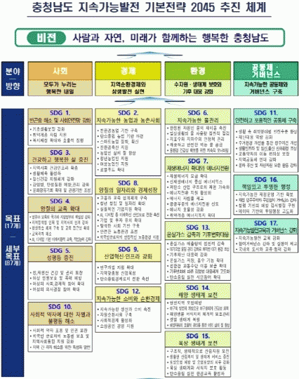 È®Á¤µÈ ±âº»Àü·«Àº ¡®»ç¶÷°ú ÀÚ¿¬, ¹Ì·¡°¡ ÇÔ²²ÇÏ´Â ÇູÇÑ ÃæÃ»³²µµ¡¯¸¦ ºñÀüÀ¸·Î ¡â»çȸ ¡â°æÁ¦ ¡âȯ°æ ¡â°øµ¿Ã¼¡¤°Å¹ö³Í½º µî 4´ë ºÐ¾ß 17°³ ¸ñÇ¥, 87°³ ¼¼ºÎ¸ñÇ¥, 68°³ ÁöÇ¥¸¦ ´ã°í ÀÖ´Ù.
