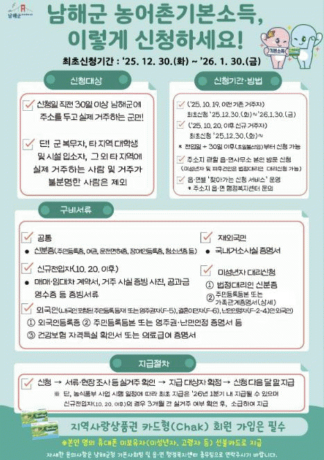 ³ó¾îÃÌ ±âº»¼Òµæ ½Ã¹ü»ç¾÷Àº ³²Çرº¿¡ Áֹεî·ÏÀ» µÎ°í ½ÇÁ¦ °ÅÁÖÇÏ´Â ±º¹ÎÀ» ´ë»óÀ¸·Î Çϸç, ´ë»óÀÚ·Î È®Á¤µÉ °æ¿ì ¿ù 15¸¸ ¿øÀ» Áö¿ª»ç¶û»óǰ±Ç(Ä«µåÇü¡¤¼±ºÒÄ«µå)À¸·Î Áö±ÞÇÏ´Â »ç¾÷ÀÌ´Ù.
