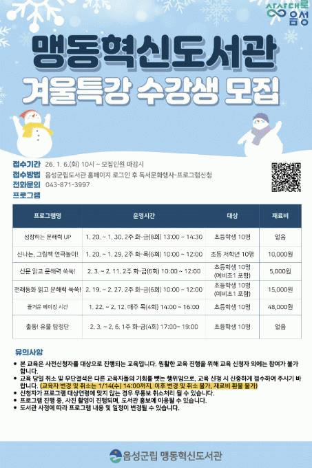 À̹ø °Ü¿ïƯ°Àº ÃʵîÇлýµéÀ» ´ë»óÀ¸·Î 6°³ÀÇ °Á¸¦ °³¼³ÇØ ¿À´Â 1¿ù 20ÀϺÎÅÍ 2¿ù 27ÀϱîÁö ¿î¿µµÈ´Ù.