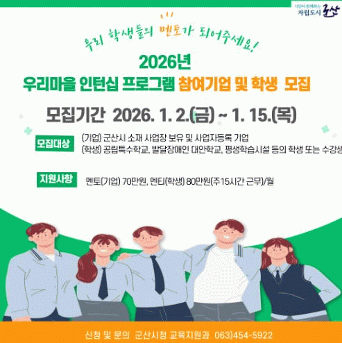 ±³À°»ýÀÇ °æ¿ì, ±º»ê½Ã ¼ÒÀç Æ¯¼öÇÐ±Þ °íµîÇб³¡¤¹ß´ÞÀå¾ÖÀÎ ´ë¾ÈÇб³¡¤Æò»ýÇнÀ½Ã¼³ µîÀÇ Çлý ¶Ç´Â ¼ö°»ý¿¡ ÇÑÇØ ¸ðÁýÇÑ´Ù.